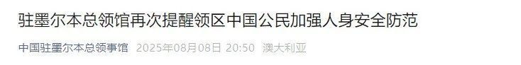 8月8日开云kaiyun官方网站,中国驻墨尔本总领馆再次指示领区中国公民加强东谈主身安全谨防。