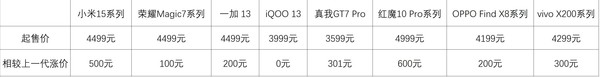 凭据统计,在近两个月上市的国产旗舰新品当中,价钱平均上升了100元到500元不等。其中,小米15系列、荣耀Magic7系列、一加 13起售价分离是4499元,相较于上一代分离涨了500元、100元、200元。iQOO 13起售价3999元,真我GT7 Pro起售价3599元,红魔10 Pro系列起售价4999元,相较于上一代分离加价0元、301元、600元。OPPO Find X8系列起售价4199元,vivo X200系列起售价4299元,相较于上一代分离加价200元、300元。为了便捷环球不雅看,咱们也作念了一张表。
