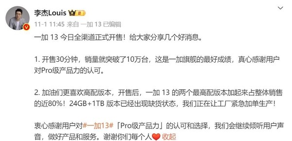 一加在首销时通常得回了不俗的获利,开售30分钟,销量突破10万台,这是一加旗舰的最佳获利,而且两个最高配版块加起来占全体销售的近80%,24GB+1TB版块那时还出现了缺货景色,浮滥者的礼聘也发挥了一加 13的居品力。